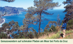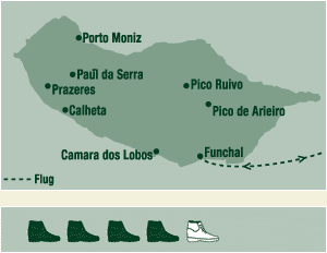 9. Tag, Mi: Freizeit am Meer Wir genießen einen freien Tag in Jardim do Mar. Wenn die Gezeiten es gestatten, kann man entlang des Wassers ins Dörfchen Paúl do Mar laufen. 10. Tag, Do: Ribeiro Frio Im Forellenort Ribeiro Frio beginnt die reizvolle Wanderung, die längs der verwunschenen Le-vada do Furado, "der in den Stein gehauenen", nach Santo da Serra führt. -150m 3,5 Std. mit-tel. Neues Quartier in Santo da Serra (3 Nächte). 11. Tag, Fr: Saõ Lourenço Die wüstenhafte Halbinsel offenbart mit ihren beeindruckenden Basalt- und farbenprächtigen Tuffformationen den vulkanischen Charakter Madeiras. Auf der Wanderung - 3 Std. mittel - gewinnt man immer wieder neue Blicke auf das umgebende Meer und die Klippen sowie auf das Bergmassiv Madeiras. Hier befindet sich der schönste Sandstrand der Insel. +/-200m 12. Tag; Sa: Im grünen Norden Entlang der Levada do Castelejo wandernd bekommen wir authentische Einblick in das ländliche Madeira der Nordküste. Kleine Gehöfte, winzige aber höchst ertragreiche Parzellen, freundlich-neugierige Menschen. Im Anschluss bleibt noch Zeit in Porto da Cruz für einen Kaffee, ein Bad im Meer oder im Meerwasserschwimmbecken. 2 Std. leicht. 13. Tag, So: Rückflug Am Sonntagmorgen ist großer Bauernmarkt in Santo da Serra. Eine letzte Gelegenheit sich mit heimischen Früchten und anderen Leckereien für die Fahrt einzudecken. Rückflug nach Frankfurt 15 Uhr, an 20.10 Uhr..